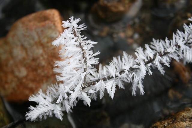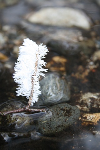 意図しないあるがままの美しさ。河原の小枝に咲いた氷の華。