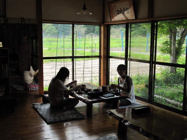 外の景色は緑がまぶしい、萌えるこの時期は何を食べてもおいしいです、って。