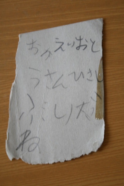 2~3日家に帰らなかった時 娘が仕事場にTELをしてきました「早く帰ってきて~」その後ろで息子が「何言ってるんだ!お父さんは仕事なんだぞ~早くTELを切れ!」 遅くなって家に戻ると息子からの手紙がありました 『おかえり おとうさん 久しぶりだね』 って書いてあります 息子が小学校1年生の時。