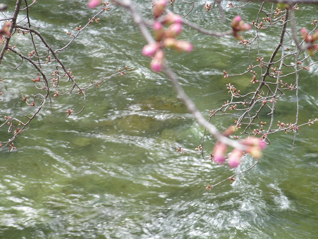 男鹿川と桜 まだまだつぼんでいます